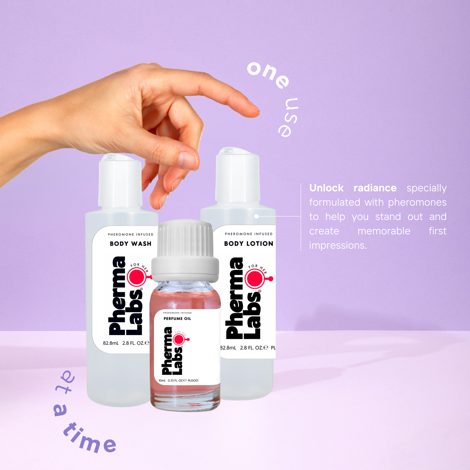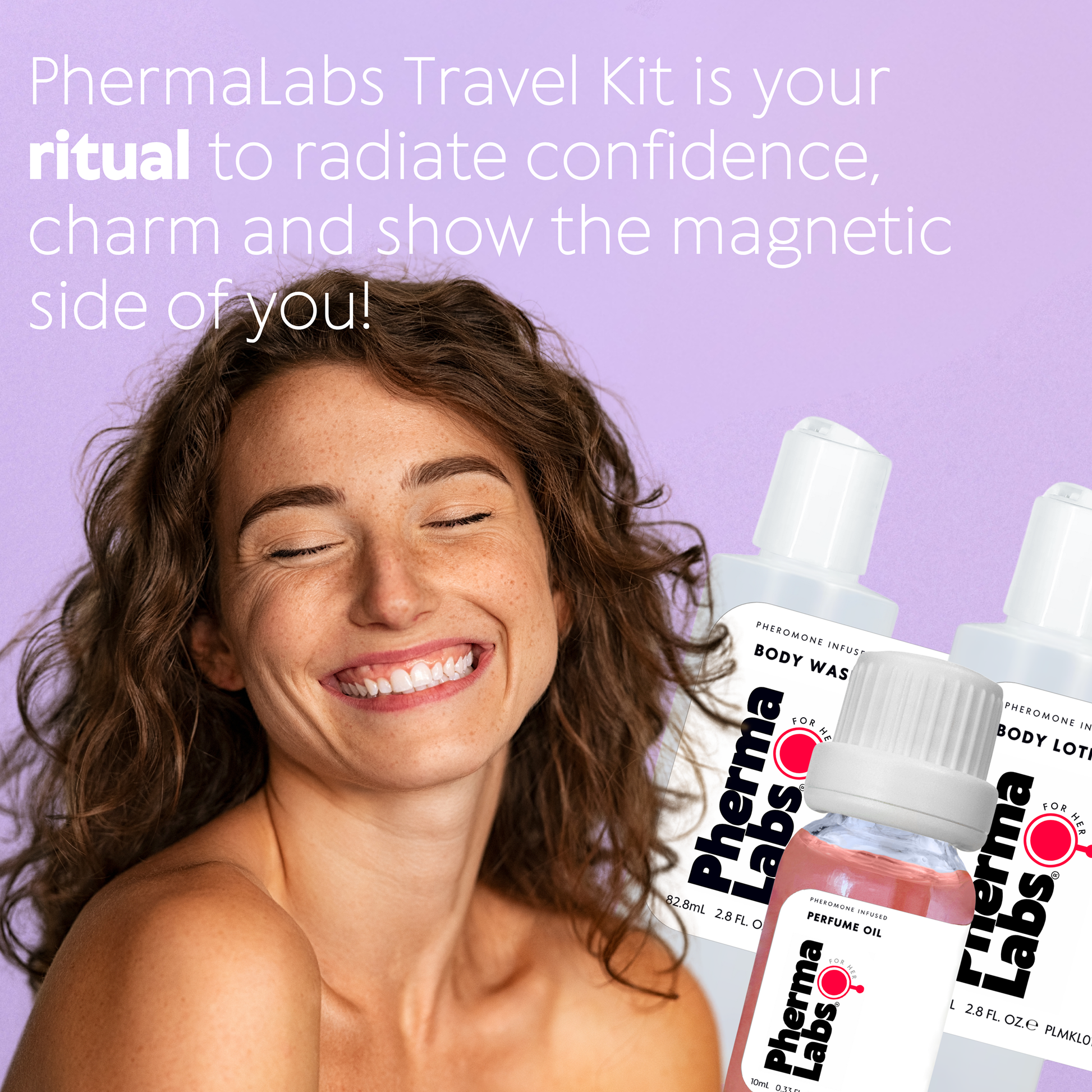Mini Travel Kit set of attraction essentials infused with pheromones[45MG] from PhermaLabs designed to Attract Men. Includes a cologne, a body lotion and a body oil.