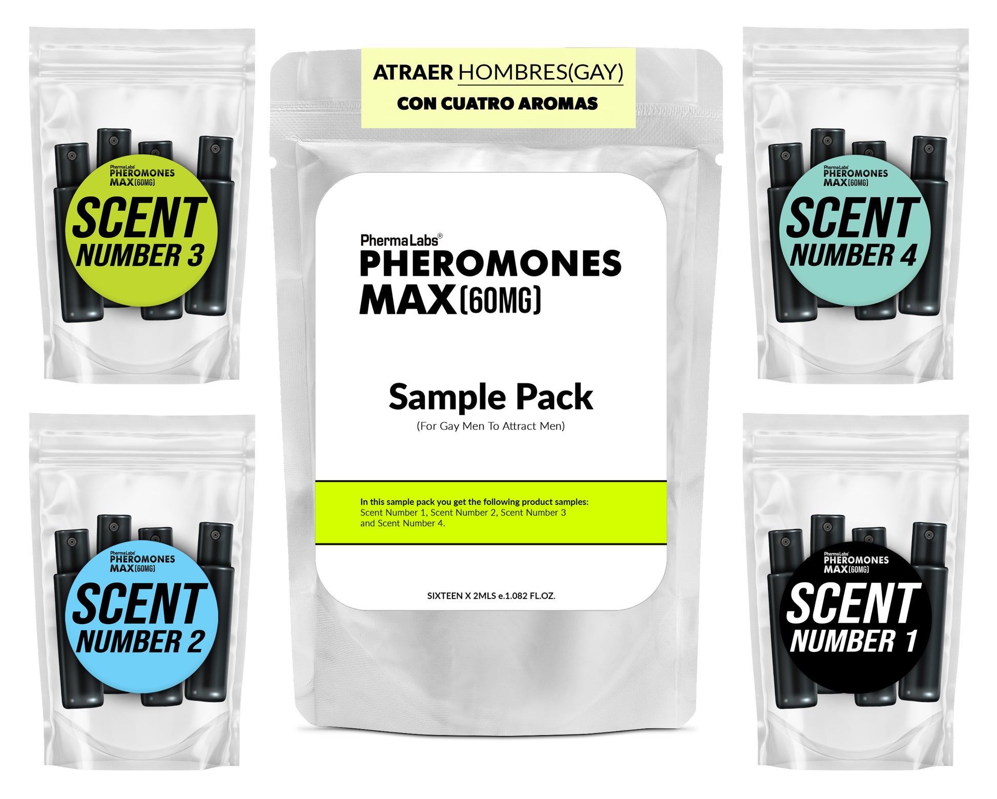 Paquete de muestra MAX de PhermaLabs con feromonas para hombre gay para atraer hombres. ¡Incluye 4 aromas max para probar!